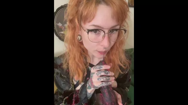 sexy tattooed redhead sucks dildo