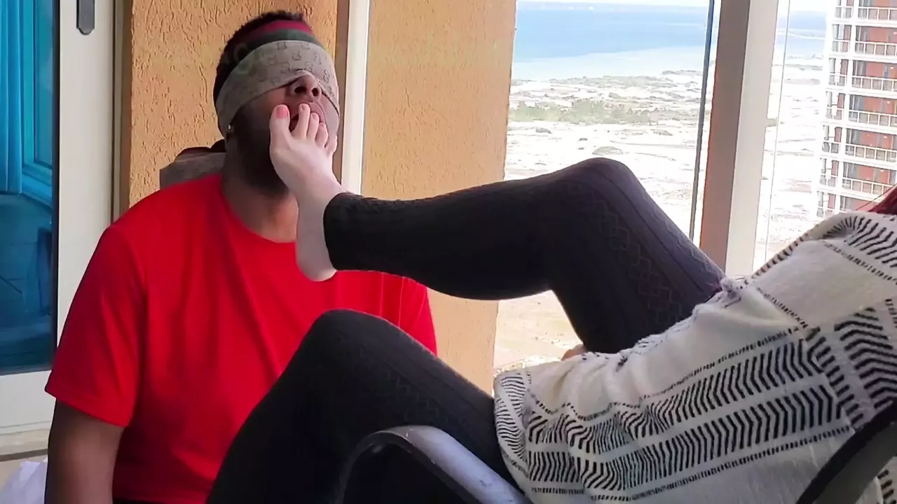 Worshiping mature lady feet while neighbors watch on balcony