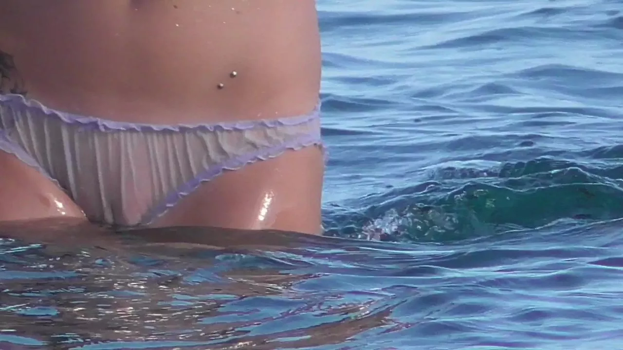 Beach girl goes for swimming in panties - watch out