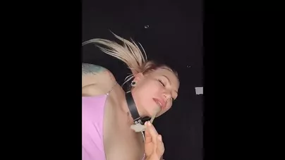 Blonde cumslut playing with cum from condom